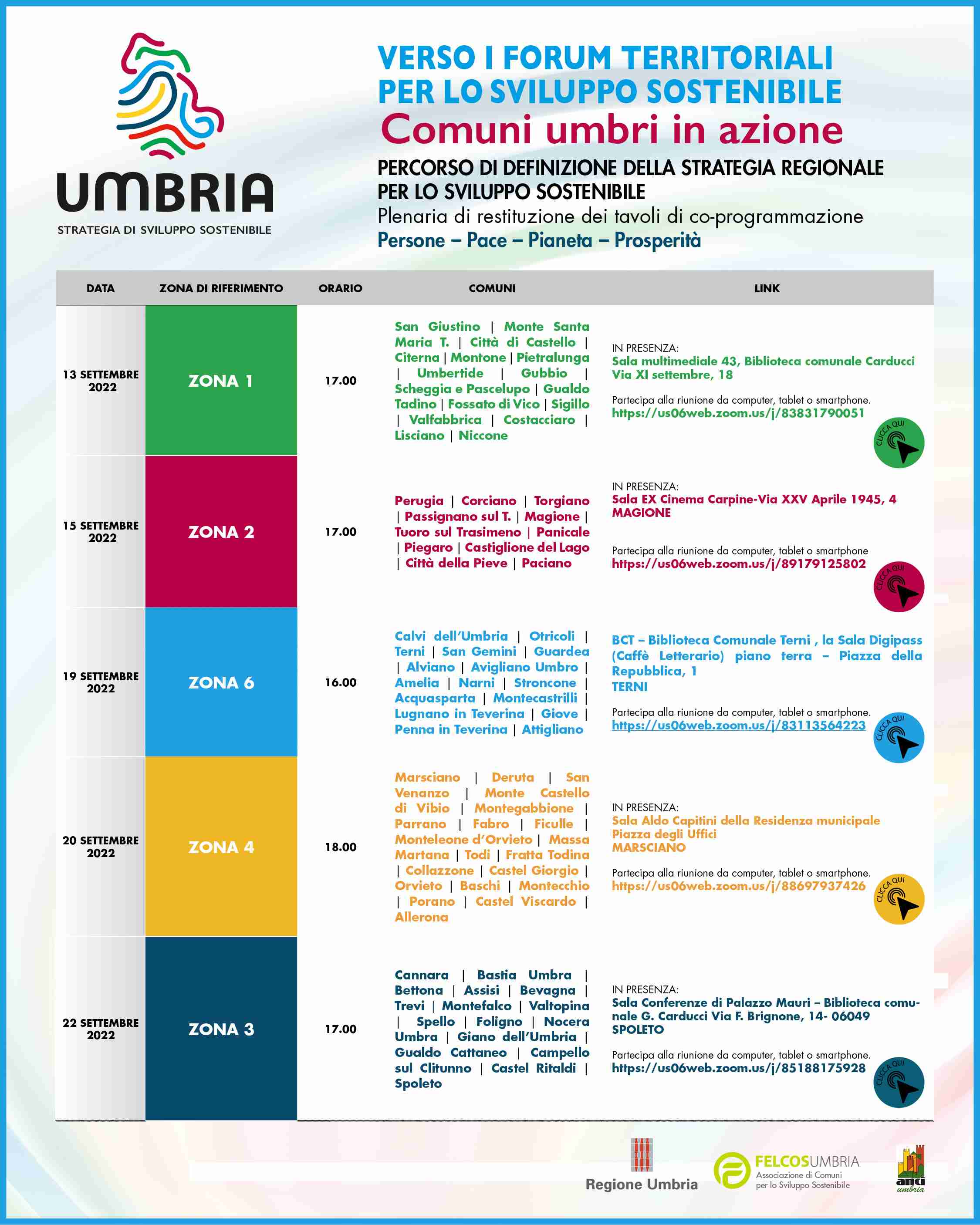 Seguirà l'incontro della Zona 2 in programma giovedì 15 settembre alle ore 17,00 presso la sala ex Cinema Carpine (via XXV Aprile 1945, n.4) del Comune di Magione ed interesserà i Comuni di Perugia, Corciano, Torgiano Passignano sul Trasimeno, Magione, Tuoro sul Trasimeno, Panicale, Piegaro, Castiglione del Lago, Città della Pieve, Paciano. Successivamente ci saranno quelli per la Zona 6 lunedì 19 settembre alle ore 16 presso la sala Digipass (Caffè Letterario) della Biblioteca Comunale di Terni (Piazza della Repubblica, 1) per i Comuni di Calvi dell'Umbria, Otricoli, Terni, San Gemini, Guardea, Alviano, Avigliano Umbro, Amelia, Narni, Stroncone, Acquasparta, Montecastrilli, Lugnano in Teverina, Giove, Penna in Teverina, Attigliano; Zona 4 martedì 20 settembre alle ore 18 presso la sala Aldo Capitini (piazza degli Uffici) nel Comune di Marsciano per i Comuni di Marsciano, Deruta, San Venanzo, Monte Castello di Vibio, Montegabbione, Parrano, Fabro, Ficulle, Monteleone d'Orvieto, Massa Martana, Todi, Fratta Todina, Collazzone, Castel Giorgio, Orvieto, Baschi, Montecchio, Porano, Castel Viscardo, Allerona; Zona 3 giovedì 22 settembre alle ore 17 sala Conferenze di Palazzo Mauri (via F. Brignone) nel Comune di Spoleto per i Comuni di Cannara, Bastia Umbra, Bettona, Assisi, Bevagna, Trevi, Montefalco, Valtopina, Spello, Foligno, Nocera Umbra, Giano dell'Umbria, Gualdo Cattaneo, Campello sul Clitunno, Castel Ritaldi, Spoleto.