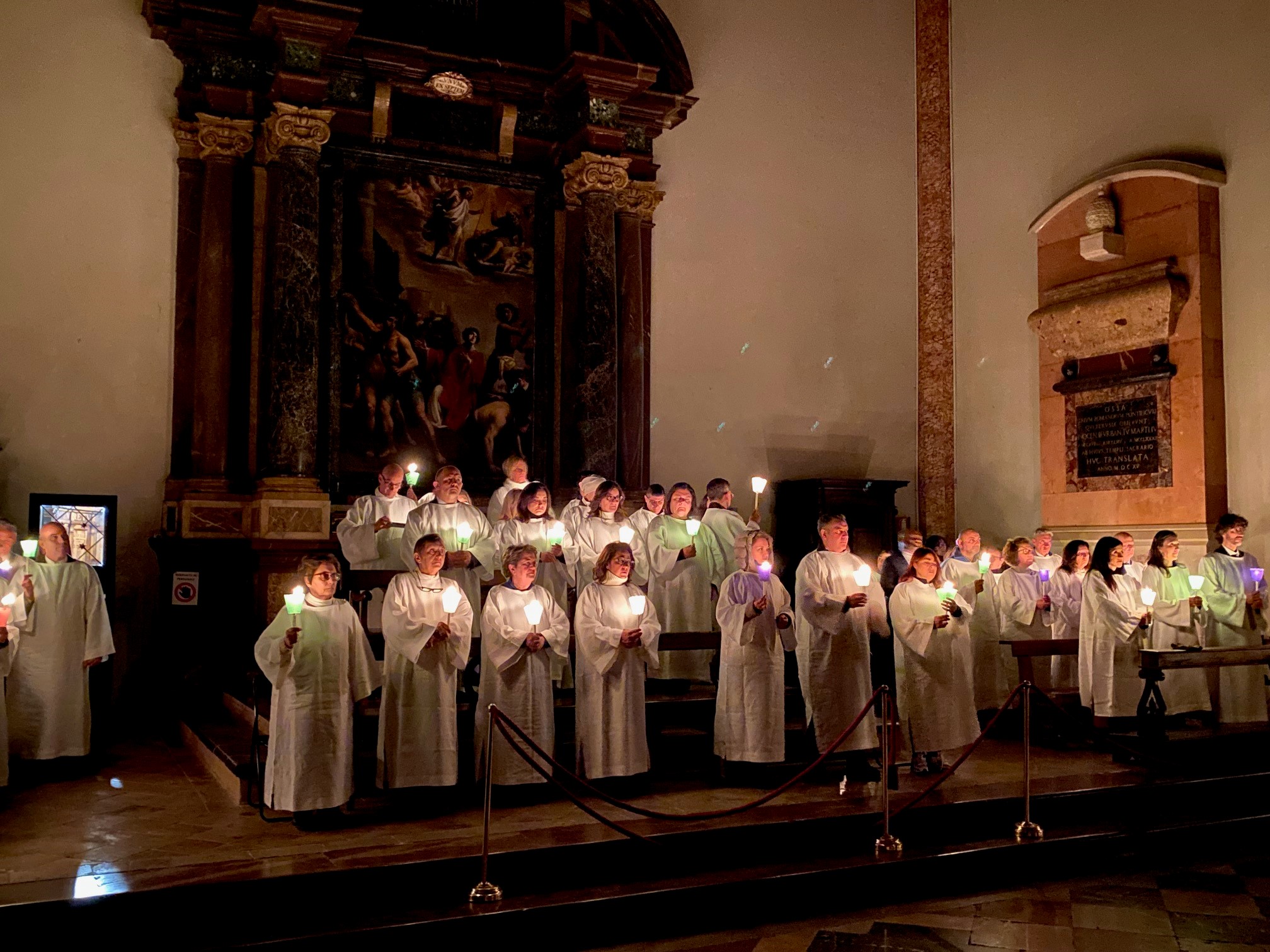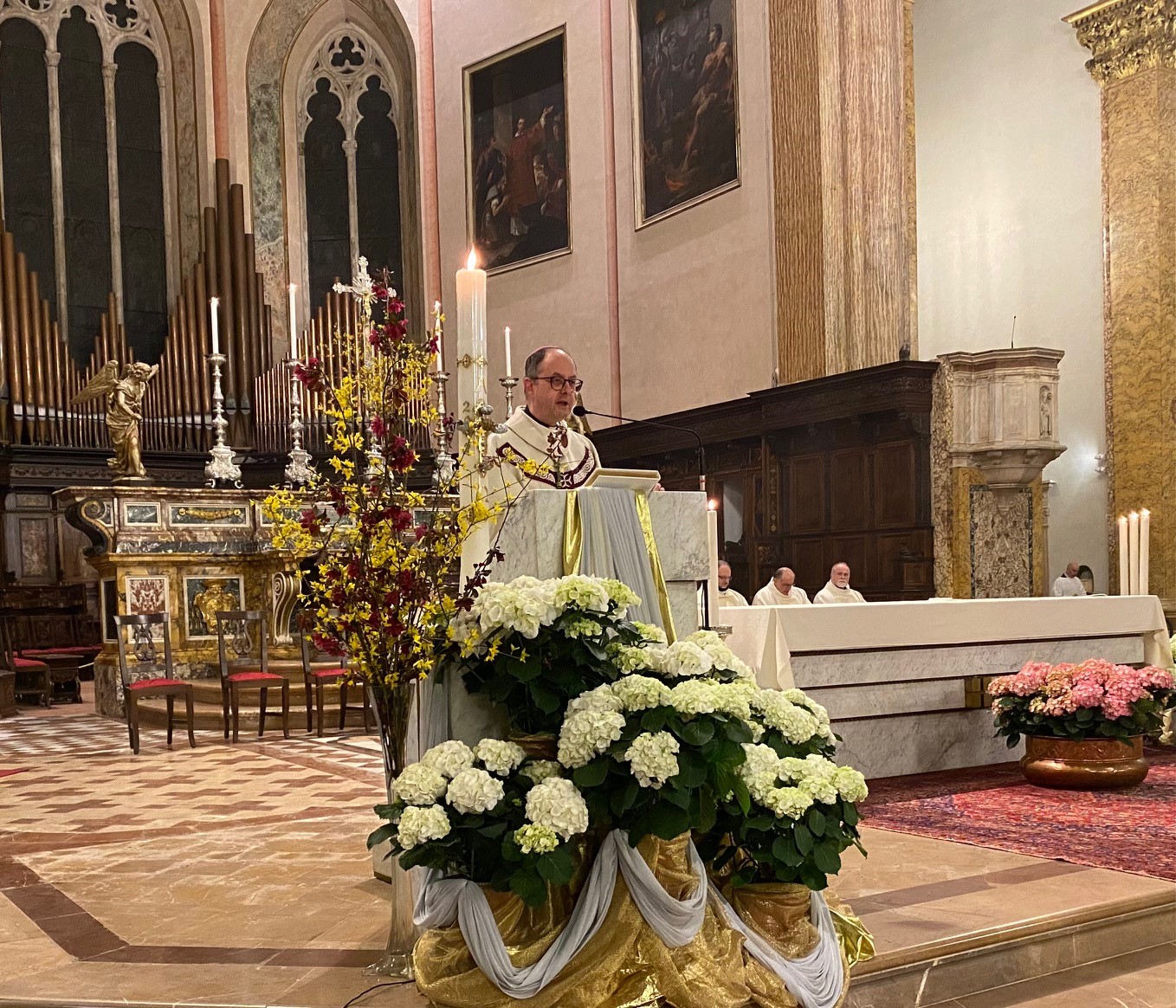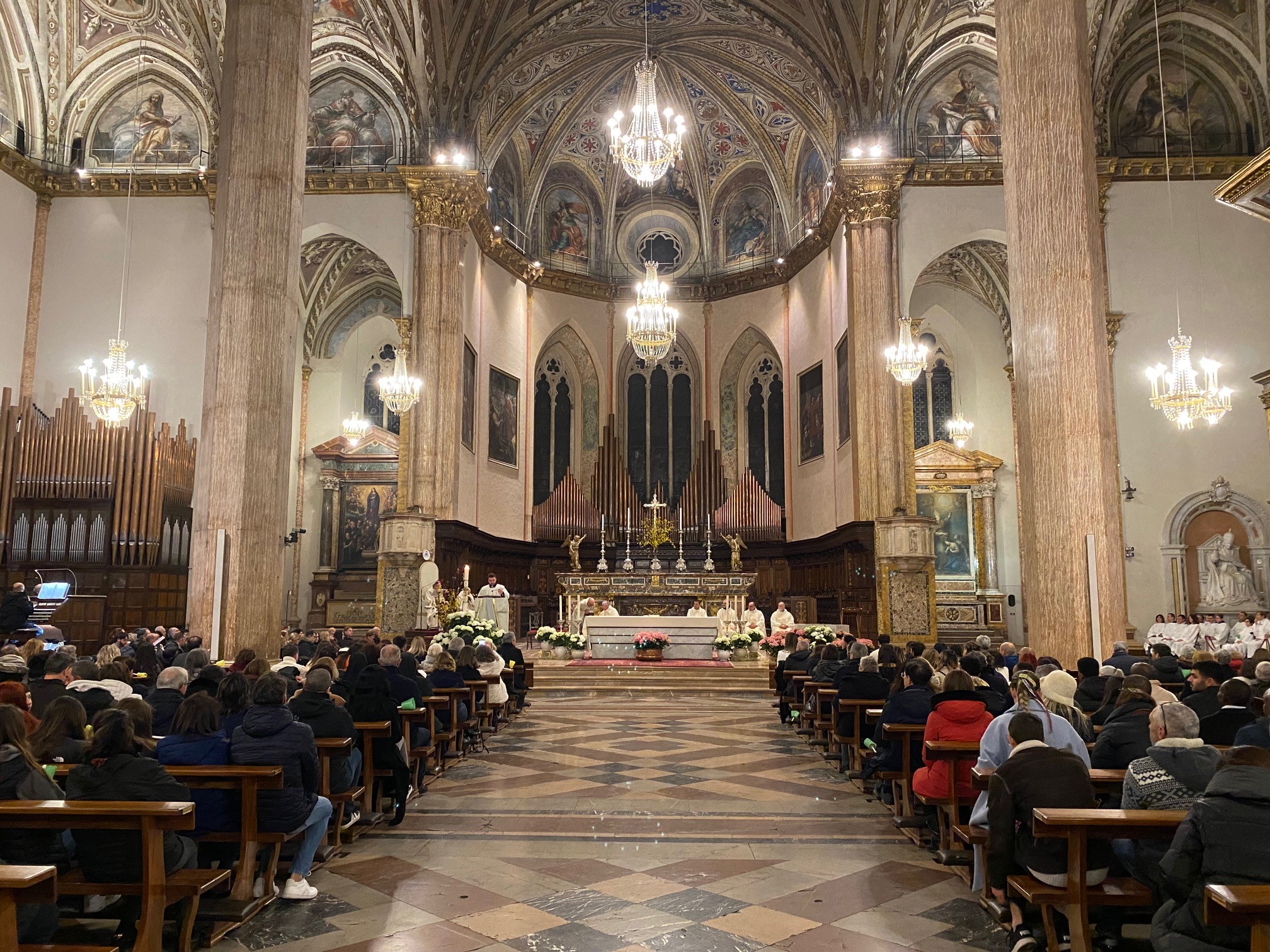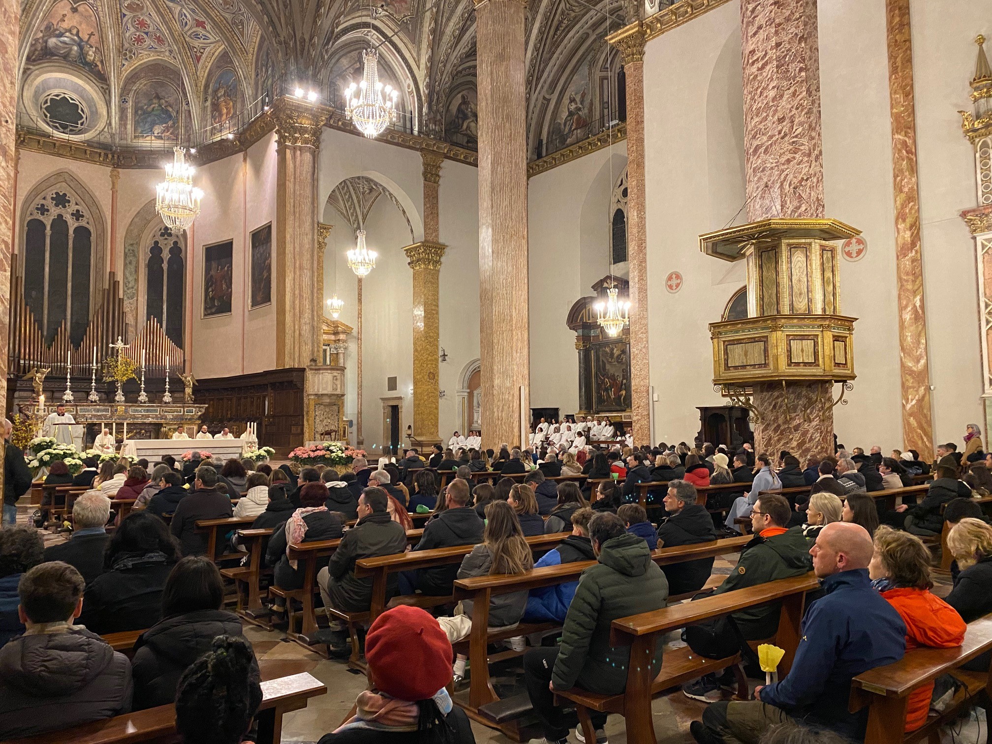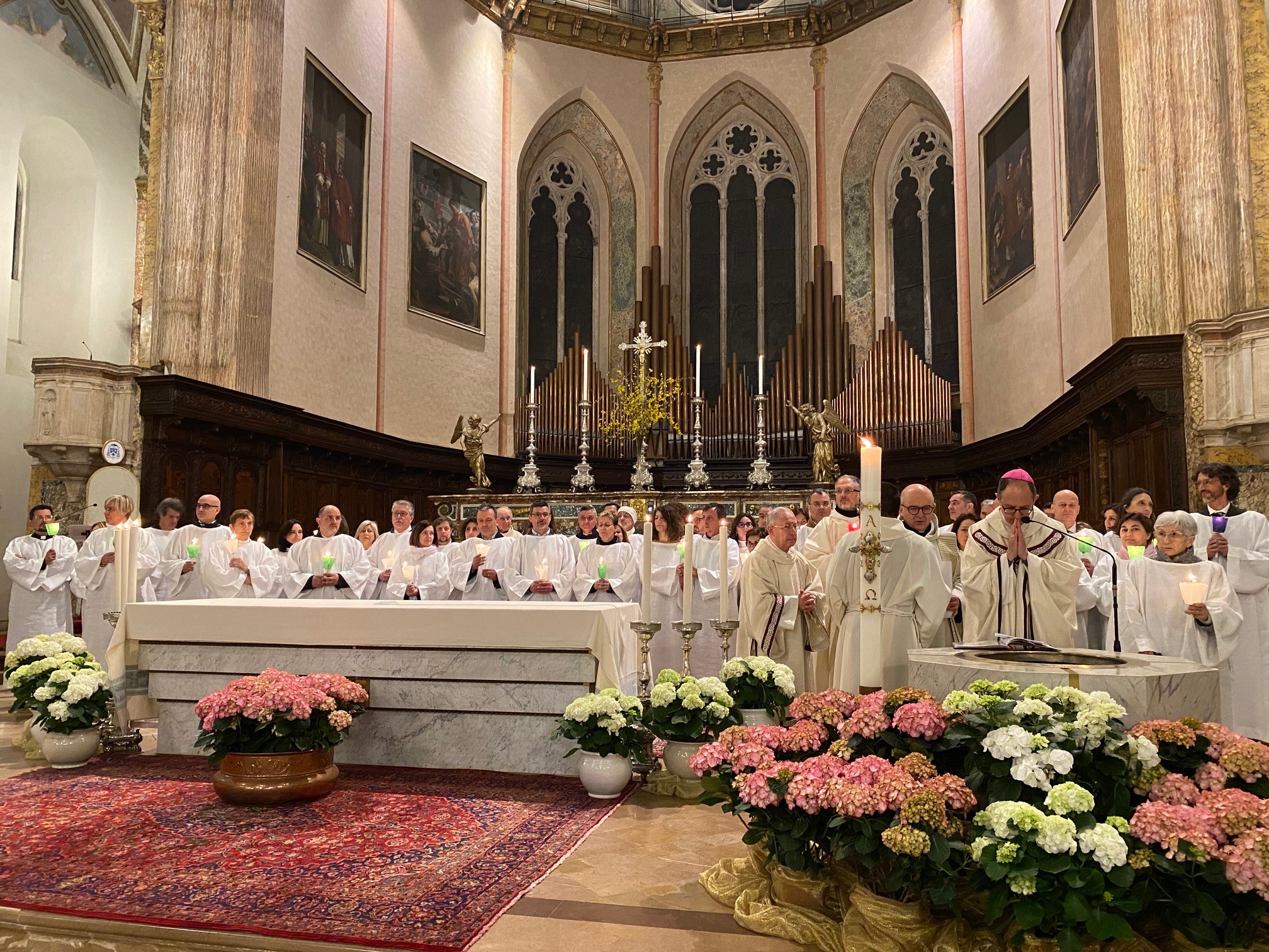 Una cattedrale gremita. È stata una Veglia pasquale molto partecipata, la prima presieduta dall’arcivescovo Maffeis dopo la sua ordinazione episcopale dello scorso 11 settembre, che ha visto concelebranti mons. Fausto Sciurpa, arciprete della cattedrale, don Calogero Di Leo, parroco del centro storico, don Fabrizio Crocioni, parroco dell’Unità pastorale di Prepo, e don Mauro Angelini, rettore della chiesa del Gesù. Ad animare la liturgia è stato il canonico sacrista don Luca Bartocci assieme ai seminaristi diocesani e la corale Laurenzia che, al termine, ha intonato l’Hallelujah dal “Messiah” di Hadel, accompagnata all’organo dal maestro Adriano Falcioni. Tra i numerosi fedeli, le comunità Neocatecumenali perugine con le vesti bianche, che hanno terminato il loro cammino, e non pochi turisti, che in questi giorni di festa soggiornano nel capoluogo umbro, gremendo la cattedrale sin dal pomeriggio del Sabato Santo per visitarla ma anche per confessarsi. Ai confessionali non si vedevano tanti fedeli in fila da prima della pandemia. Un ritorno alla fede praticata?