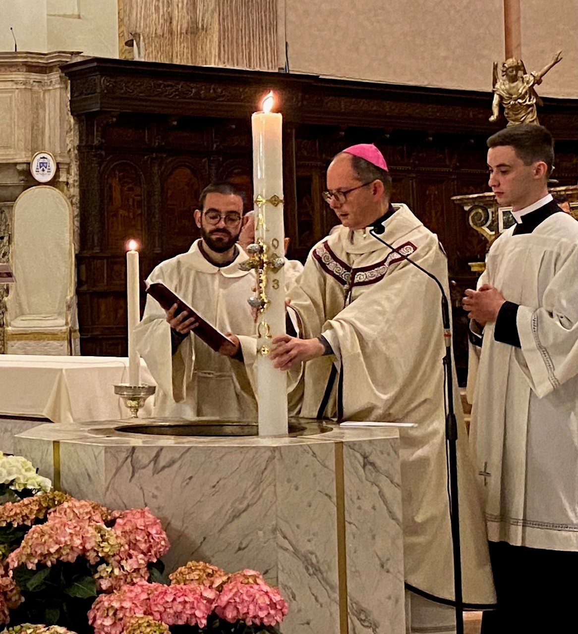 I riti della Veglia. La liturgia battesimale è stato uno dei riti caratterizzanti la Veglia pasquale, “la madre di tutte le celebrazioni cristiane”, come l’ha definita mons. Maffeis, insieme alla benedizione del fuoco, all’accensione del cero pasquale e alla benedizione dell’acqua immergendo il cero nel fonte battesimale.