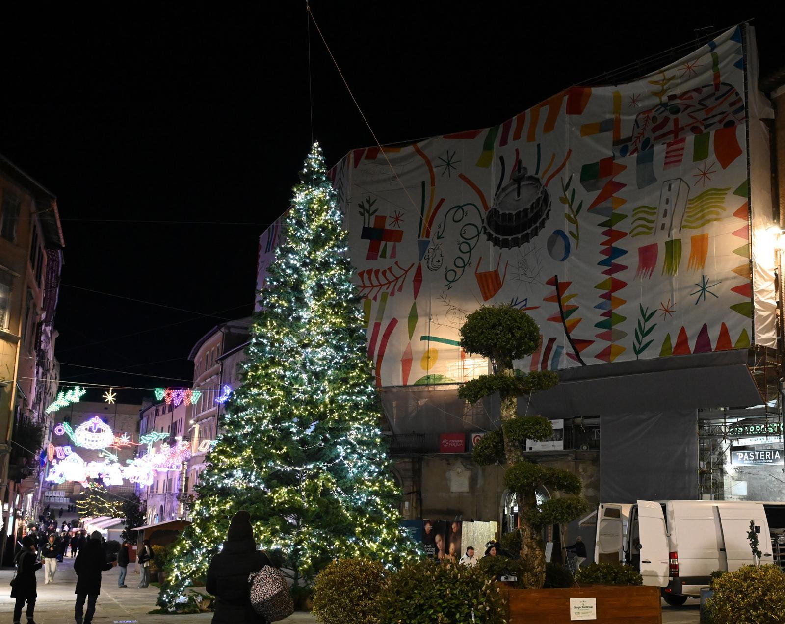 L'accensione delle luminarie tradizionali e delle Luci d'Artista firmate da Mimmo Paladino, allestite lungo Corso Vannucci e in piazza IV Novembre, ha trasformato l'acropoli in uno scenario di grande suggestione, unendo simboli della tradizione perugina a un linguaggio artistico contemporaneo.