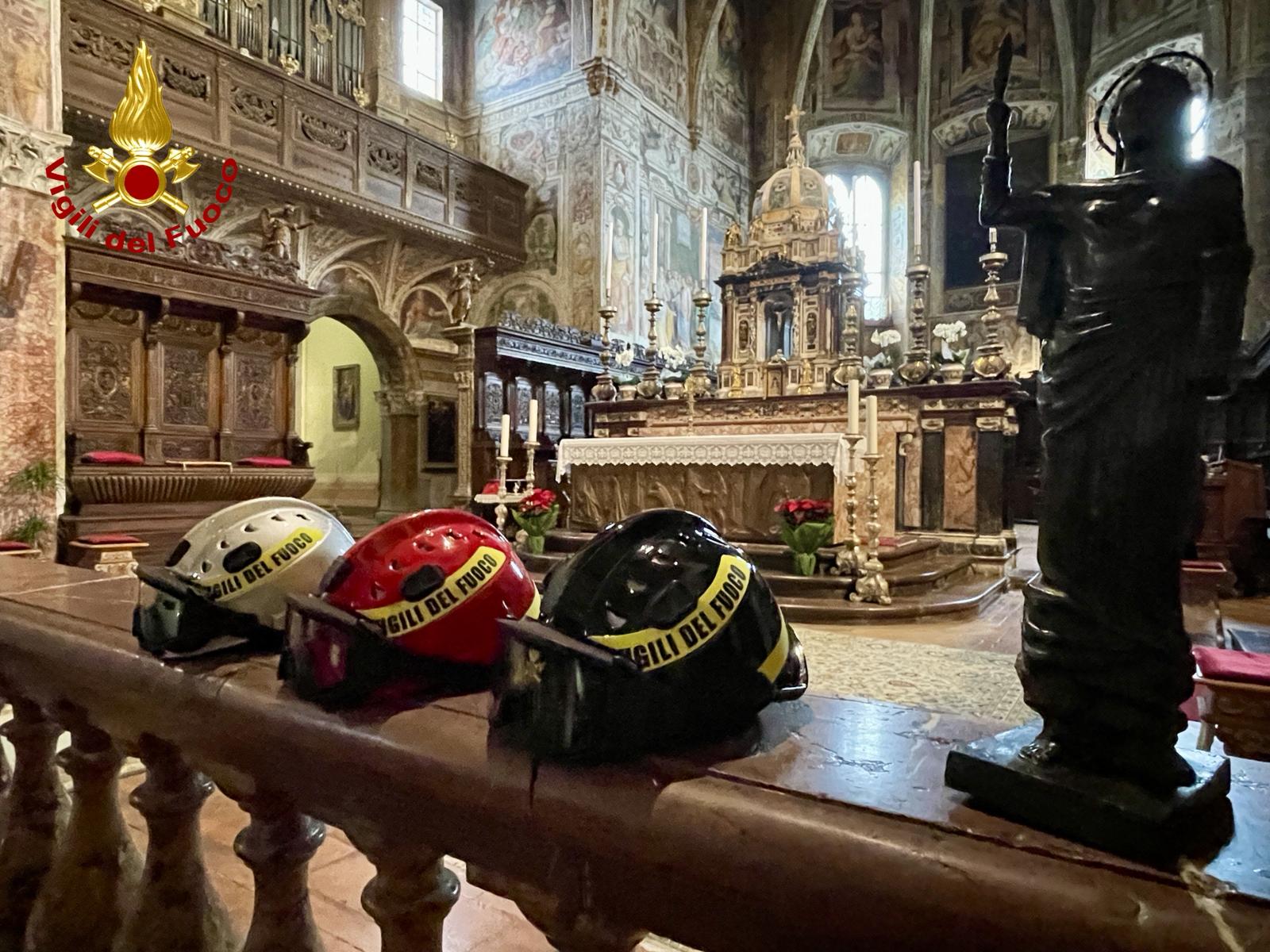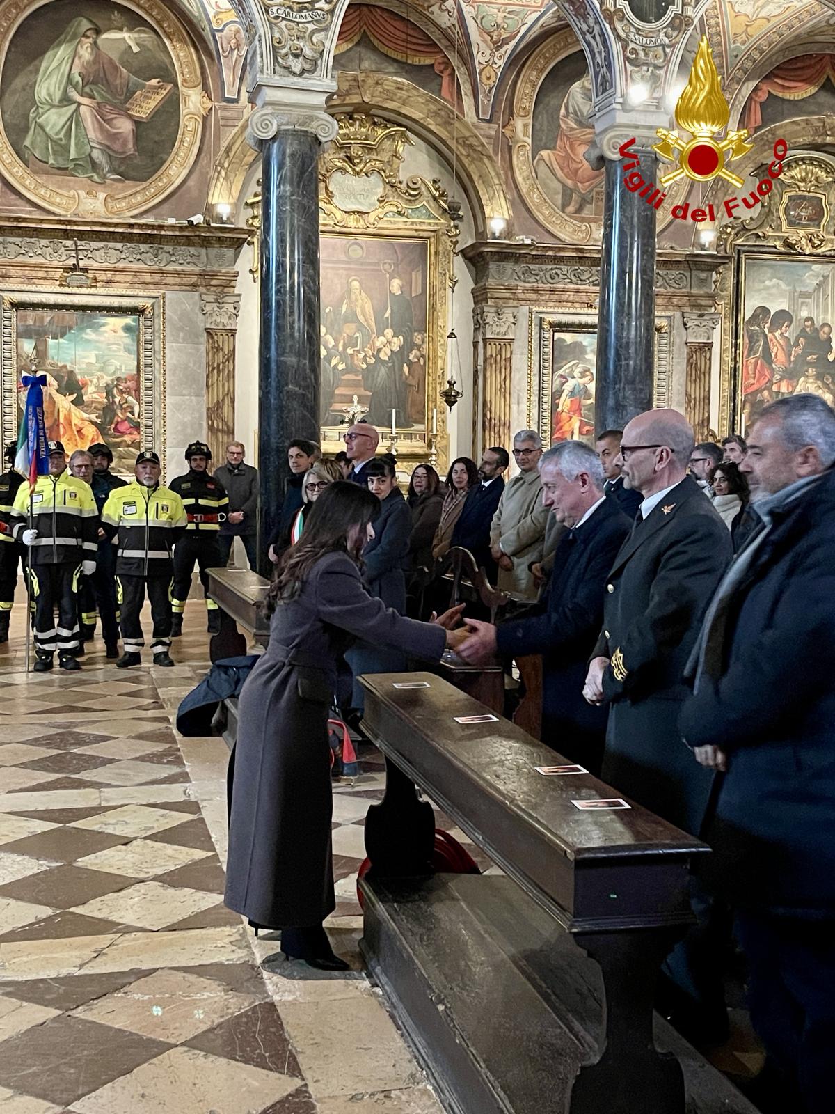 Al termine della cerimonia, il Direttore ha consegnato a Mons. Maffeis una piccozzina simbolica, riproduzione in scala dello strumento operativo in dotazione al personale, insieme a una copia manoscritta della Preghiera del Vigile del Fuoco, realizzata dall’artista Gianpiero Bianchini.