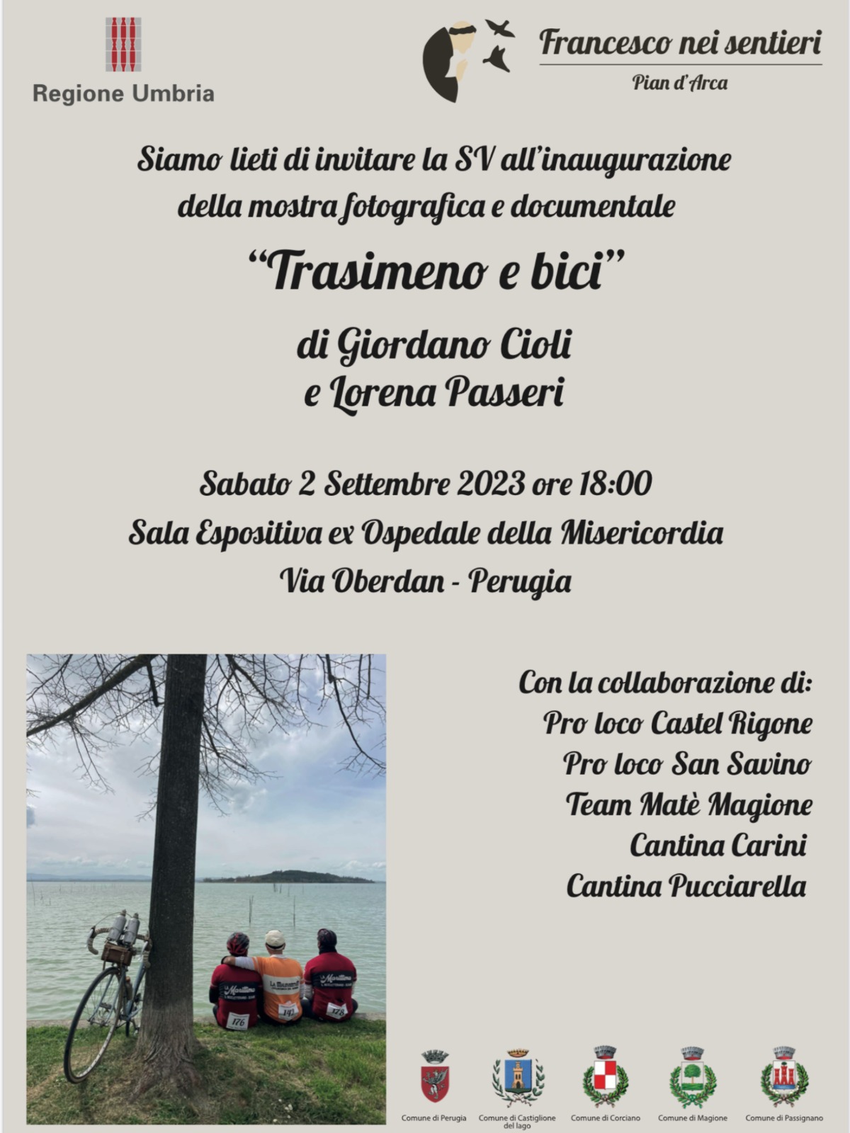 (UNWEB) – Perugia, . – Sarà inaugurata sabato 2 settembre alle 18 nella sala espositiva dell'ex Ospedale della Misericordia, in via Oberdan, a Perugia, la mostra fotografica e documentale 'Trasimeno e bici' di Giordano Cioli e Lorena Passeri. L'evento è inserito nelle attività dell'Asd Francesco nei sentieri, che organizza l'omonima cicloturistica d'epoca, ed è stato realizzato insieme alla Regione Umbria, con la collaborazione di Pro loco Castel Rigone, Pro loco San Savino e Team Matè Magione. Insieme a Cioli e Passeri, saranno presenti Cesare Galletti, presidente dell'Asd Francesco nei sentieri, Clara Pastorelli, assessore allo sport del Comune di Perugia, Eugenio Rondini, consigliere regionale dell'Umbria, e Michela Sciurpa, presidente di Sviluppumbria.